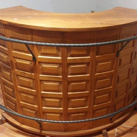 Flot bar med 4 barstole. Spiritus ophæng (uden flasker), barklokke, Carlsberg platte og flere glas medfølger.