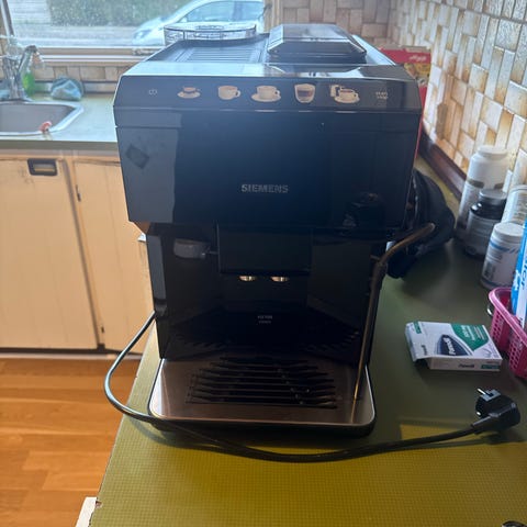 Jeg har været meget glad for min kaffemaskine, men desværre er den begyndt at lække noget vand. Den virker fint efter rensning og afkalkning, men efter 10 kopper begynder den at dryppe. Jeg har fået tilbud fra Siemens på reparation, men jeg har gloet mig sur på den. Der medfølger 3 pk ekstra rensetabletter, samt en ekstra mælkekande. Brygmodulet er lige skiftet.