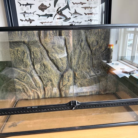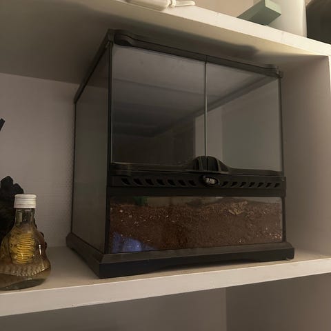 Terrarium i glas med frontventilation i form af en lang ventilationsrist. Terrariet er egnet til hold af mindre terrariedyr, f.eks. krybdyr eller padder, afhængigt af behov for indretning og teknik. Indvendigt ses jordbund/substrat og belysning. Velegnet som glasbur, hvor der er behov for god udsigt til dyrene og mulighed for at tilpasse indretningen med skjul, planter og teknisk udstyr efter artens krav.