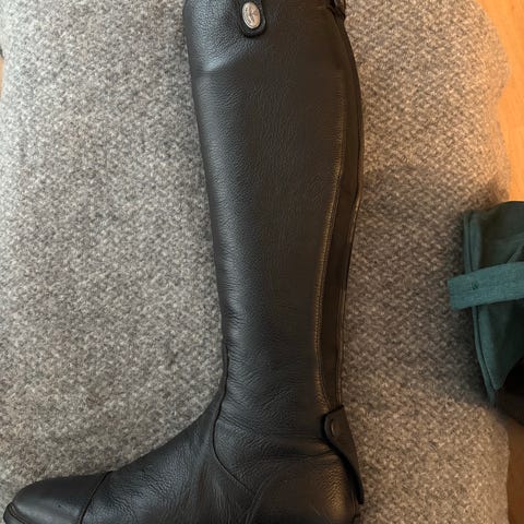 Ridestøvler, DeNiro ridestøvle, str. 41, Grundet vægttab er jeg nød til at sælge mine stævne støvler. De er syet efter mål i 2017, kun brugt til stævner. Højde 49 cm på indersiden med høj bue. Stiv yderside og blød inderside. Bredde venstre 48,5 cm og højre 50,2 cm. Lidt misfarvning af stigbøjler ( ikke forsøgt at fjerndet) lidt slid ved stigremme. Der medfølger nye ekstra såler, sporeremme og oppustelig afstiver. Nypris 6700kr