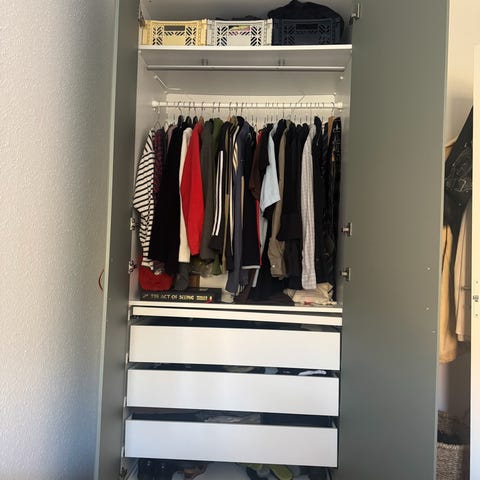 Skabet har været brugt i walk-in closet og har derfor ingen låger/skydelåger, men det kan man naturligvis selv tilkøbe i IKEA. Skabet har heller ikke bagbeklædning – det har ikke været nødvendigt.