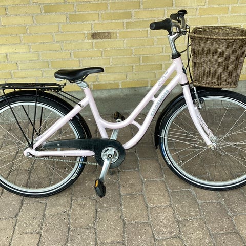 Kildemoes børnecykel med 24" hjul. Cyklen har grå stel og skærme samt fælge med pink detaljer. Udstyret med kurv foran og bagagebærer bagpå. Lav indstigning gør den egnet til børn. Velegnet til hverdagskørsel til skole og fritidsaktiviteter.