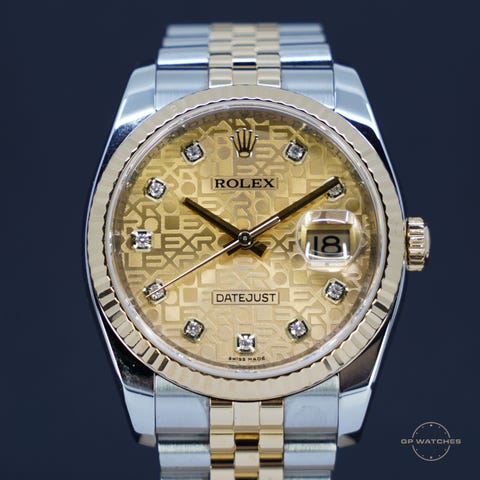 Rolex Datejust 116243. Det populære datejust i guldstål 36 mm med den skjulte lås. Denne model er noget helt særligt, da det er 43-udgaven som er født med diamantkrans fra Rolex og kombineret med den flotte champagne skive med diamanter er det virkelig en sjælden model. Kommer med boks, papirer (2014) og serie nr tjek fra Rolex.