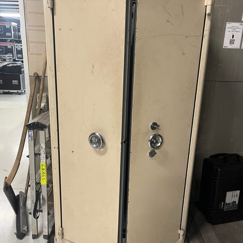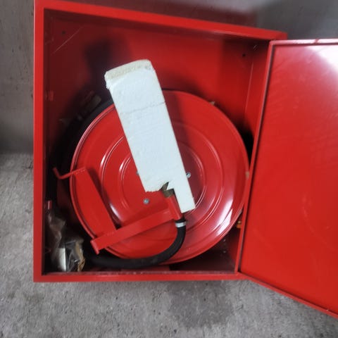 Brandskab med brandslange i rød metal.