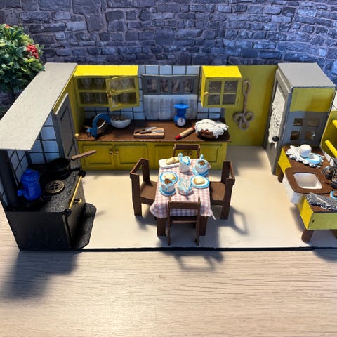 Retro. Miniature køkken dukkehus-møbel sæt med tilbehør. Sættet består af et komplet køkkenmiljø med køleskab, komfur, køkkenbordplade med skabe, spisebord og stol. Der medfølger diverse små køkkenredskaber og madartikler som tallerkener, kopper, kande, brød, æg og andre detaljerede tilbehørsdele. Indretningen er samlet på en bundplade med gulv og vægge, så det kan bruges som selvstændig køkkenscene i et dukkehus eller som samlerobjekt. Farverne er primært orange, brune og hvide med forskellige mønstre og detaljer.