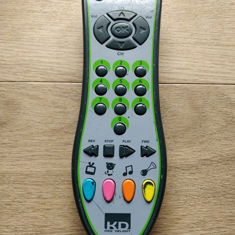 Dette er en farverig legetøjsfjernbetjening designet til børn. Den har knapper med tal fra 0 til 9 i forskellige farver, samt musik- og medieknapper. Legetøjet er interaktivt med lyde og lys, og har en størrelse på 7,5x17,5 cm.