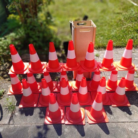 Afspærring, 50 cylindere, med refleks, uden fødder, samt 2 pakker med hver 500 meter afmærkningsbånd (rød og hvid), altsammen ubrugt