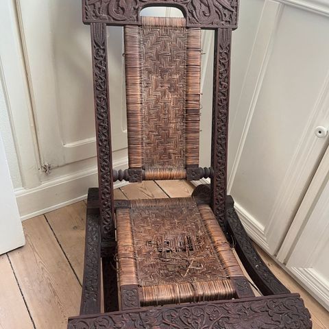 Sjælden ensbenet træstol fra Mali, sandsynligvis Dogon, dateret ca. 1920–1940, i god stand, dimensioner 61 × 30 × 5 cm, fra tysk samling. Klik på den blå "gå til varen" knap, for at købe eller byde på denne vare. Den samlede pris vil blive vist inden du afgiver dit bud.