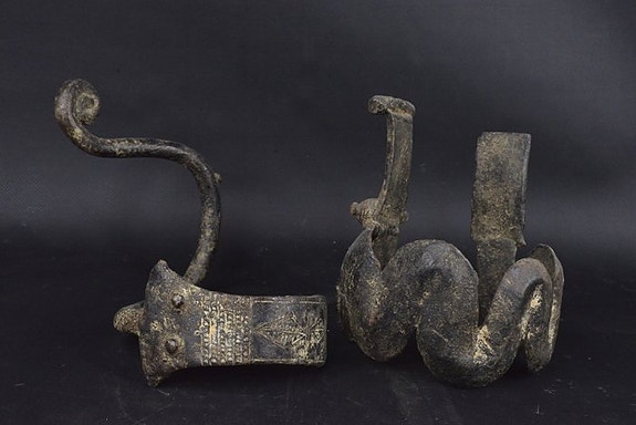 Et meget gammelt Dogon-helligdomsobjet af ekstraordinær skulpturel kvalitet, der forestiller et par Nommo-figurer. Fremstillet af hårdttræ med en mørk overflade. Spor af alder og brug.