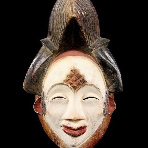 Gurunsi træhjelmmaskemask med skildring af en får eller antilope, oprindelse Burkina Faso, ca. 54 cm lang, dateret omkring 1910–1940, i god stand med tegn på slitage, fra en tysk samling. Klik på den blå "gå til varen" knap, for at købe eller byde på denne vare. Den samlede pris vil blive vist inden du afgiver dit bud.