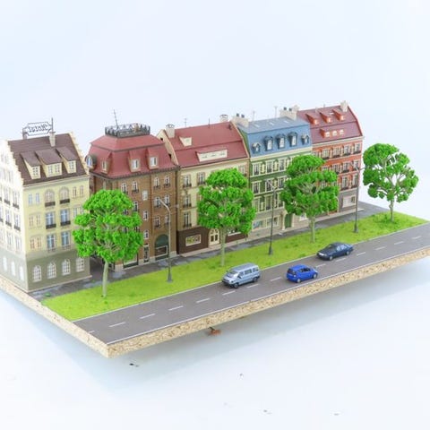 Stor diorama med en del af en by med postkontor, bryggeri, brandstation og lejlighedshus.