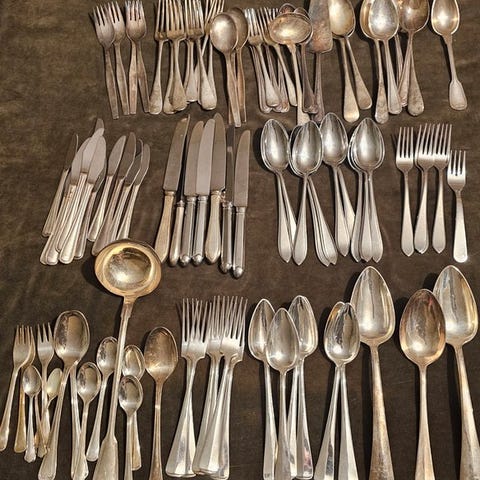 neoveda versilbert - Bestiksæt til 6 personer (42 dele) - Sølvbelagt bestiksæt i fremragende stand. Anbefales at polere grundigt med et egnet sølvprodukt for at genoprette den rette glans. Sølvbelagt er stadig meget smukt. Når poleret komplet sæt til seks personer bestående af: 6 portionsknive, 25,5 cm; 6 portionsgafler, 21 cm; 6 portionsskjeer, 21 cm; 6 dessertknive, 21 cm; 6 dessertgafler, 18 cm; 6 dessertskjeer, 18,5 cm; seks små skeer til the eller is, 14 cm