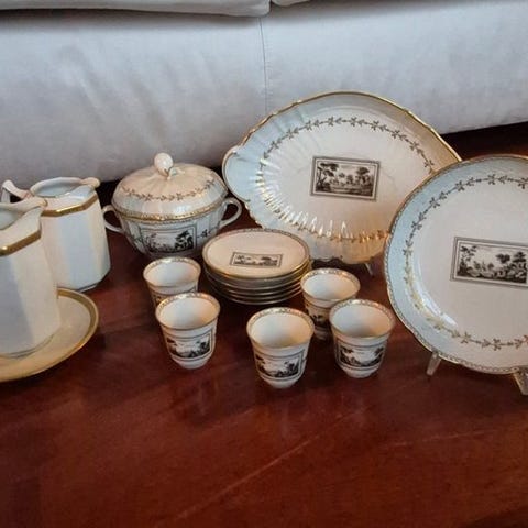Tilstanden er god i lyset af alderen, det præciseres, at nogle kopper og underkopper har årer i keramikken, og gildingen er delvist forsvundet på nogle af dem