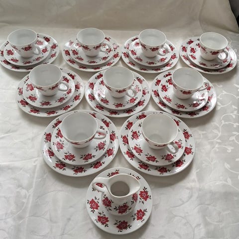 Sæt på 38 dele kaffesæt af August Warnecke porcelæn i purpur, Kina, et tysk designet mønster kendt for sine lilla og hvide blomstermotiver