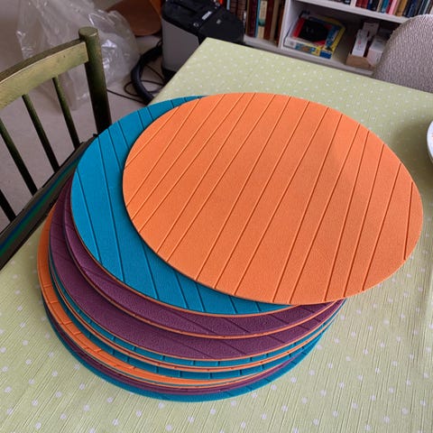 4 helt nye og ubrugte runde hynder . 35 cm i diameter 3 cm tykke . Gråt tæt vævet bomuld . Kan hentes i Aarhus eller Østerbro . Sælges samlet
