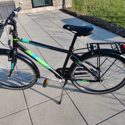 Klassisk børnecykel med 7 gear og en kombination af fodbremse og håndbremse til drengen på 10-12 år. Skoleklar med bagagebærer, lås og batteribaglygte.