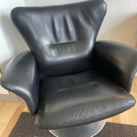 Jeg har en ægte læder sort stol fra hjort Knudsen og den fejler ingenting og har ingen ridser og huller og den skal se rynke ud😁 den er så dejlige blød at sidde på og man læner sig godt tilbage mål fra gulv til sædet 43 cm. Fra gulv til ryglæn 1.35 cm. Fra sædet til ryglæn 54 cm og dybde 57.længde 110 cm.