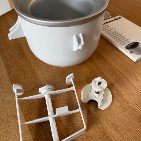 KitchenAid ismaskine skål i hvid. Sættet består af fryseskål, piskeris/omrører og låg/drevdel samt brugsanvisning. Skålen bruges sammen med en KitchenAid røremaskine til fremstilling af is, sorbet og lignende frosne desserter. Indersiden er glat og beregnet til nedfrysning før brug. Velegnet som ekstra eller erstatningsskål til kompatible KitchenAid røremaskiner.