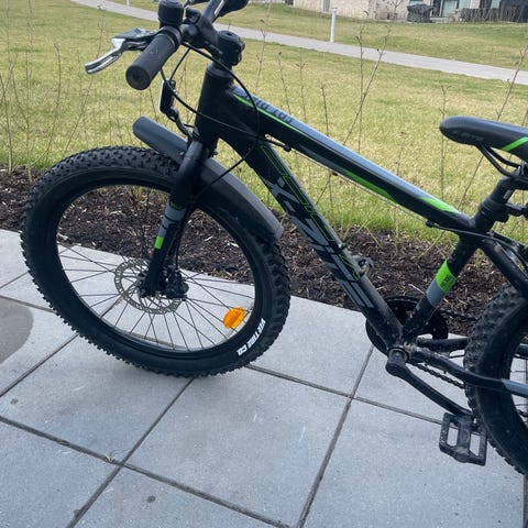 Fatbike børnecykel med 24" hjul. Cyklen har sort stel og brede dæk, som giver stabilitet på forskellige underlag. For- og baghjul har forskellige farver, hvilket gør cyklen let genkendelig. Velegnet som børnecykel til kørsel på både vej og lettere terræn. Den fejler ingenting, og har kun lidt alm hverdagsslid.