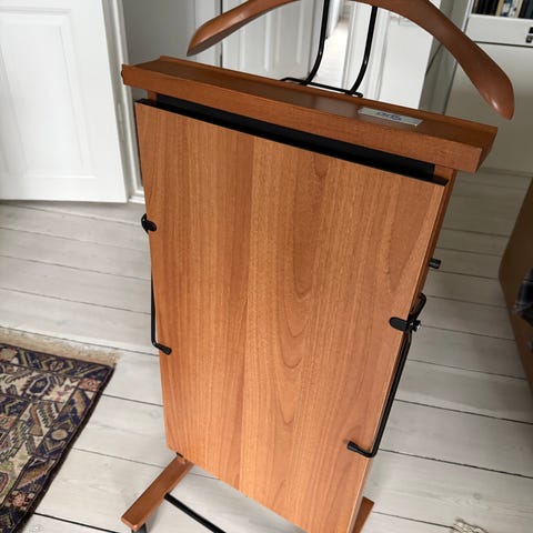 Clatronic skjorte- og buksepresser. Apparat til automatisk udglatning og tørring af skjorter, bluser og bukser ved hjælp af varm luft. Leveres med separate holdere til overdele og bukser. Egnet til hjemmebrug til at reducere krøller i tøj efter vask.