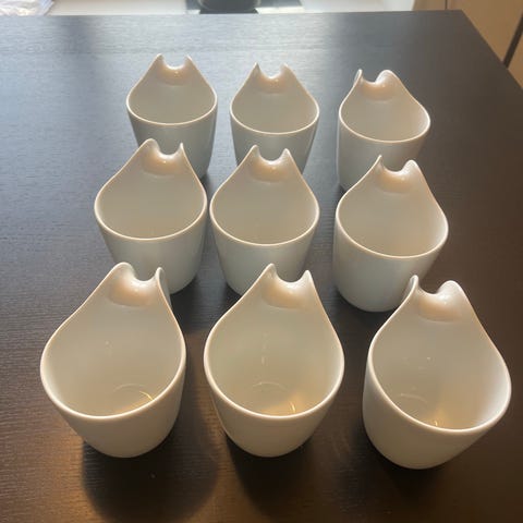 Royal Copenhagen krus i hvidt porcelæn. Krusene har et karakteristisk, buet håndtag og en glat, blank overflade. Velegnet til servering af varme drikke som kaffe, te eller kakao i køkken eller spisestue. Designet gør dem egnede til daglig brug såvel som til borddækning ved gæstebud.