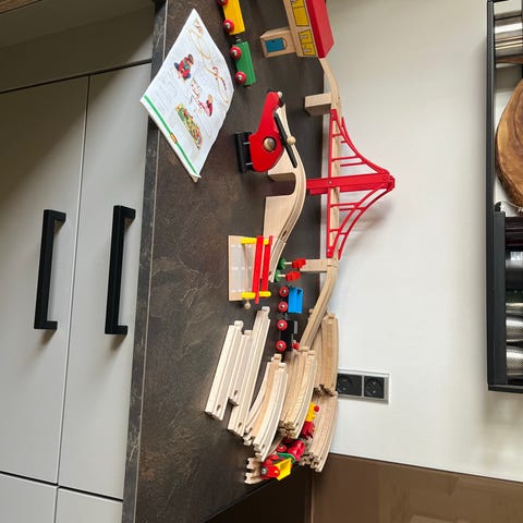 BRIO togbane i træ. Sættet indeholder forskellige træs skinner, broer og tilbehør som bygning, køretøjer og mindre dele til opbygning af en togbane. De enkelte dele kan kombineres på flere måder og passer til andre BRIO trætogbaner i standardstørrelse.