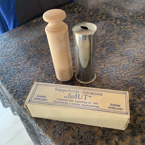 Bollesprøjten der stadig ligger i den originale æske, der har teksten fløde - kage og bollesprøjten "SMUT".