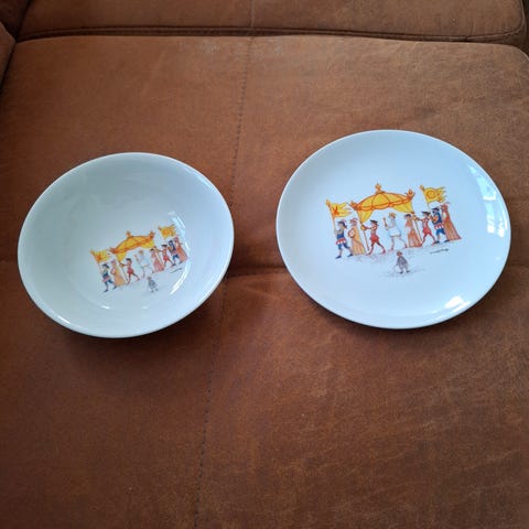 Adam & Eve tallerkener i porcelæn. Tallerkenerne er runde med hvid midte og bred blå kant. Egnet til servering af fx forretter, desserter eller mindre anretninger. Dekoren er enkel og grafisk, og bagsiden er mærket med Adam & Eve-seriens stempel fra Design House Stockholm.Der er ni tallerkner på 20 cm. De fem er med enkel guld kant de fire med en ekstra enkel tyndere guld kant