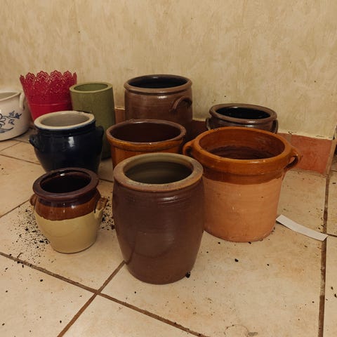 Sæt med to blomsterkrukker i keramik i orange farve. Krukkerne har en rund form og glaseret overflade med let rillet struktur. Egnede til indendørs brug til mindre planter eller som urtepotteskjulere på vindueskarm eller bord. I bunden står der 814-12 W.Germany. På den mærke som er på den ene bund har der stået Sydnye desværre er det ved at være udvasket. Farven Orange tror jeg er meget sjælden jeg har ikke kunnet finde andre krukker i den model og i Orange. Sælges samlet for 150 kr Kan sendes Køber betaler fragten.