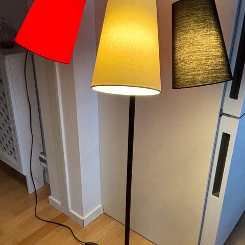 Gulvlampe med 3 lampeskærme i friske farver ca 140 cm høj fra ikke ryger hjem,sender ikke .