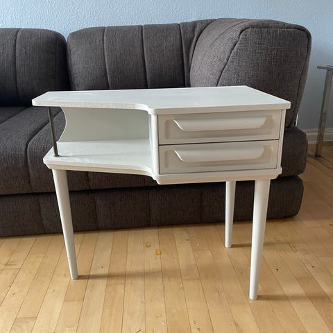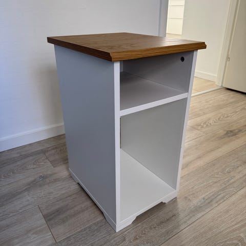 Sælger mit smukke sidebord, som jeg har brugt som natbord. Købt nyt i august 2024, og bortset fra nogle næsten usynlige små vandmærker i bunden (se sidste billede) er der ingen skader på det, og det er stadig omtrent så godt som nyt.