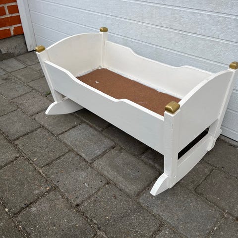 Vugge i hvid og pink med udskårne og påmalede krone- og hjerte-motiver på siderne. Vuggen er udført i hårdt materiale, formentlig træ eller MDF, med åbne sider og udskæringer, der giver indkig til indersiden. Designet er særligt rettet mod børn med prinsesse-tema, og vuggen kan anvendes til leg eller som dekorativ børneværelsesindretning, afhængigt af størrelse og anvendelse. Velegnet hvor der ønskes et enkelt, tematiseret møbel i lyse farver.