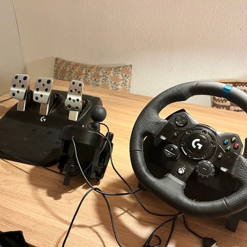 Logitech G29 racerrat med pedaler og separat gearskifter i sort. Sættet består af et rat med knapper og drejeknap til styring, et pedalmodul med tre pedaler (kobling, bremse og speeder) samt en manuel gearskifter med H-skifte. Egnet til brug med kompatible spillekonsoller eller pc til racerspil.