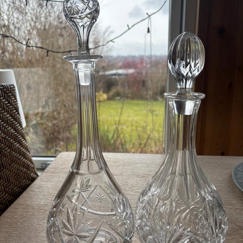 Glassene måler 11*8 cm, flasken måler 20*9*6 cm.