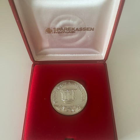 En medalje har motiv med teksten "Fredericia 325 år 16. dec. 1650-1975" med bykort samt "Grundlagt af Frederik III".