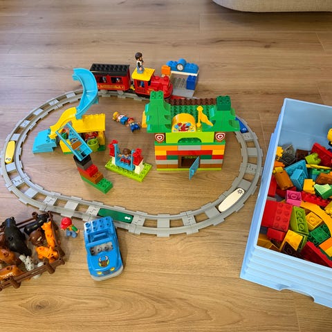 LEGO DUPLO togsæt med farverige klodser og vogne.