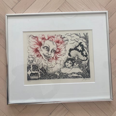 Super dekorativt Indrammet grafisk tegning af Julir Lutzen. Motivet er et abstrakt, geometrisk by- eller huslandskab med stærke kontraster og skarpe vinkler. Trykket er signeret og dateret 2012 i nederste hjørne. Det er monteret i en enkel, mørk ramme med glas og ophængssnor på bagsiden, klar til ophængning på væg.