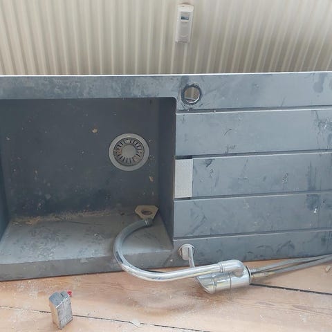 Køkkenvask mærket Blanco med enkeltkumme i sort kompositmateriale. Vasken har forboringer til armatur og sæbedispenser samt bundventil.
