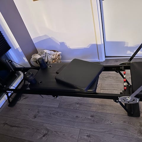 Den er brugt i et par måneder i forbindelse med min uddannelse til reformerinstruktør samt lidt hjemmebrug. Den er selvfølgelig ikke på niveau med de dyre maskiner i centrene – men den gør det, den skal, og er perfekt til hjemmetræning. Der medfølger jump board.