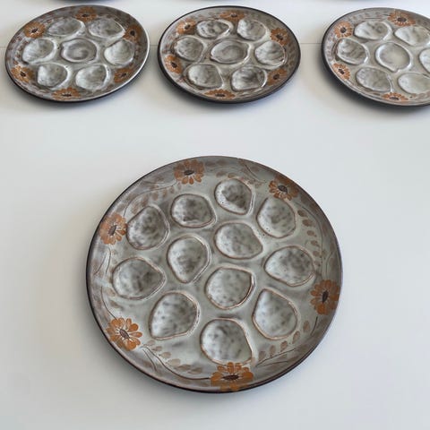 De er fra Sarreguemines porcelæn France, som er håndmalet og dekoreret med ægte guld rundt om kanten. De måler 17 cm i diameter.
