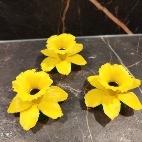 De gule stager i plast er formet som livagtige påskeliljer, med grøn fod og rødt center.