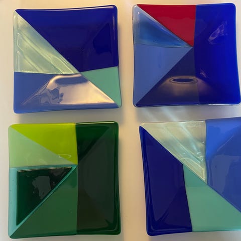 Annelise Christensen skål i glas med felter i blå og turkis. Skålen er håndlavet i Danmark, hvilket fremgår af mærkningen på undersiden. Velegnet som serveringsskål eller dekoration.