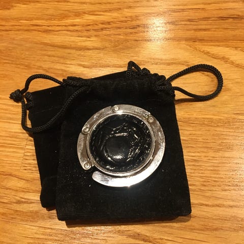Bag holder, to be put on the table edge, hang your bag or carrying bag etc. on the hook and let go of dirty floors. Inclusive velour bag. Ideal girlfriend gift.