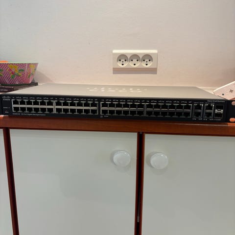 Cisco SG300-28 netværksswitch med 28 Gigabit Ethernet-porte.
