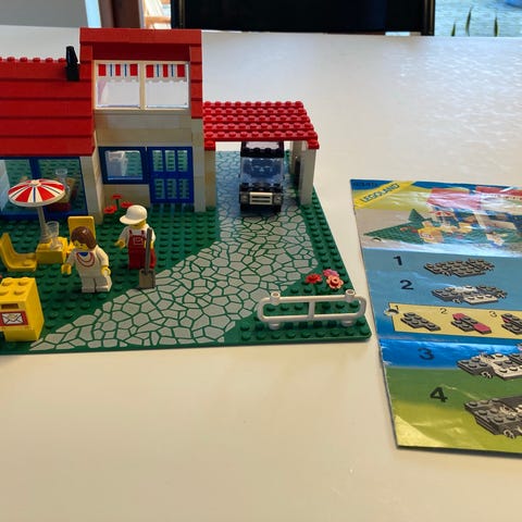 LEGO City legosæt med hus, have og bil. Fra 1980’erne. Æske og samlevejledning. Sættet er 99 % indtagt.