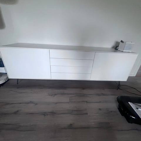 Fra BoConcept, med tre skuffer med touch lukning. 2 hylder med skydelåge. Valnød/hvid højglans.