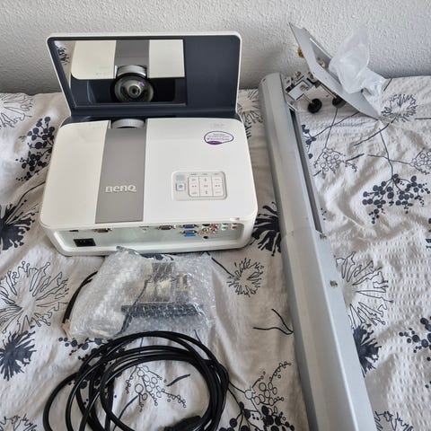 Sælger denne benq w1070 projektor. Der medfølger beslag så den kan hænges i loftet, og styres med den tilhørende fjernbetjening. HDMI-kabel kan medfølge (mener det er omkring 10 meter).