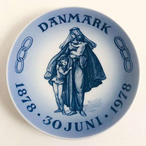 Royal Copenhagen Mindeplatte 1978. Designer: Chr. Thomsen Diameter: 18 cm Odd Fellow-platte. Kvinde med to børn. Fremstillet i anledning af 100-års dagen for oprettelsen af den første loge i Danmark. - I 1918 blev der produceret en lignende mindeplatte, faktisk med samme motiv - se annonce med denne platte.