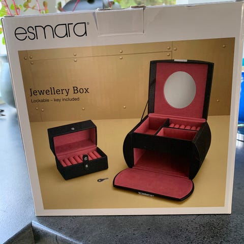 Sort smykkeskrin med mange rum.