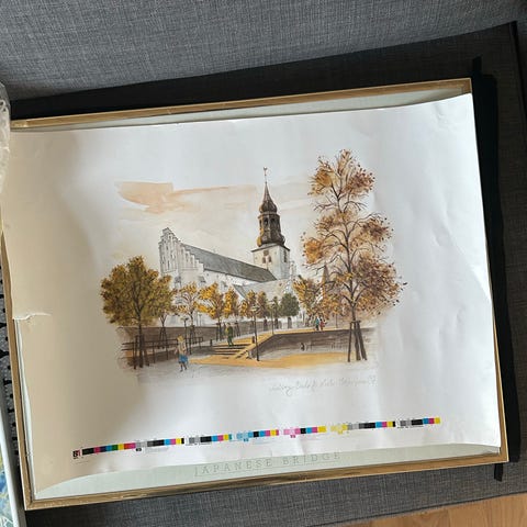 Flot grafisk tryk af Nicolai Hammer med motiv af Budolfi Kirke i Aalborg.
